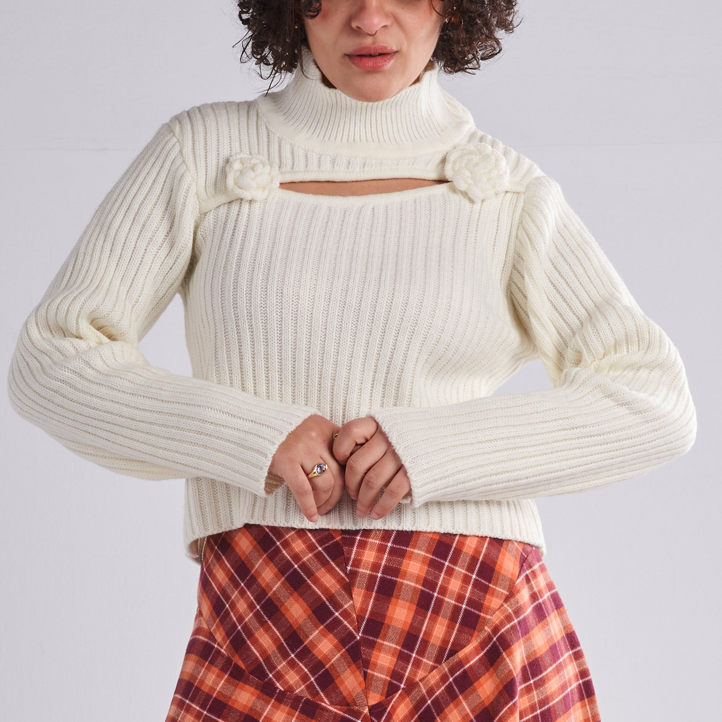 One-size pullover with a cutout, and two flower details, comes in a relaxed fit.